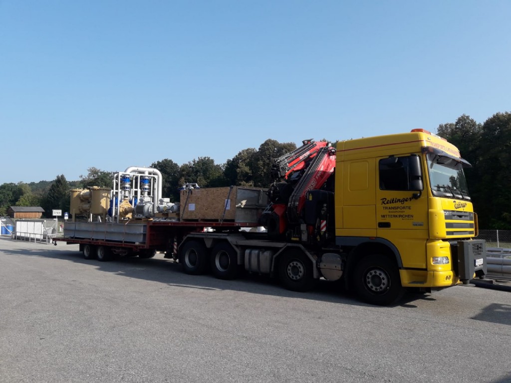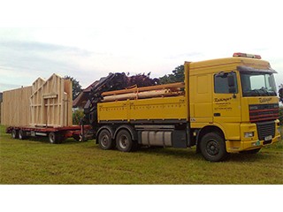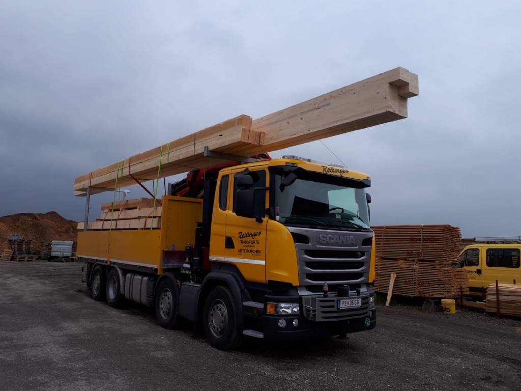 Mit diesem Fahrzeug können normale sowie Sondertransporte durchgeführt werden. Wir transportieren unter anderem Holzriegelwände, Eisenrohre, Container, Maschinenteile, Betonelemente oder alle Arten von Eisenkonstruktionen.